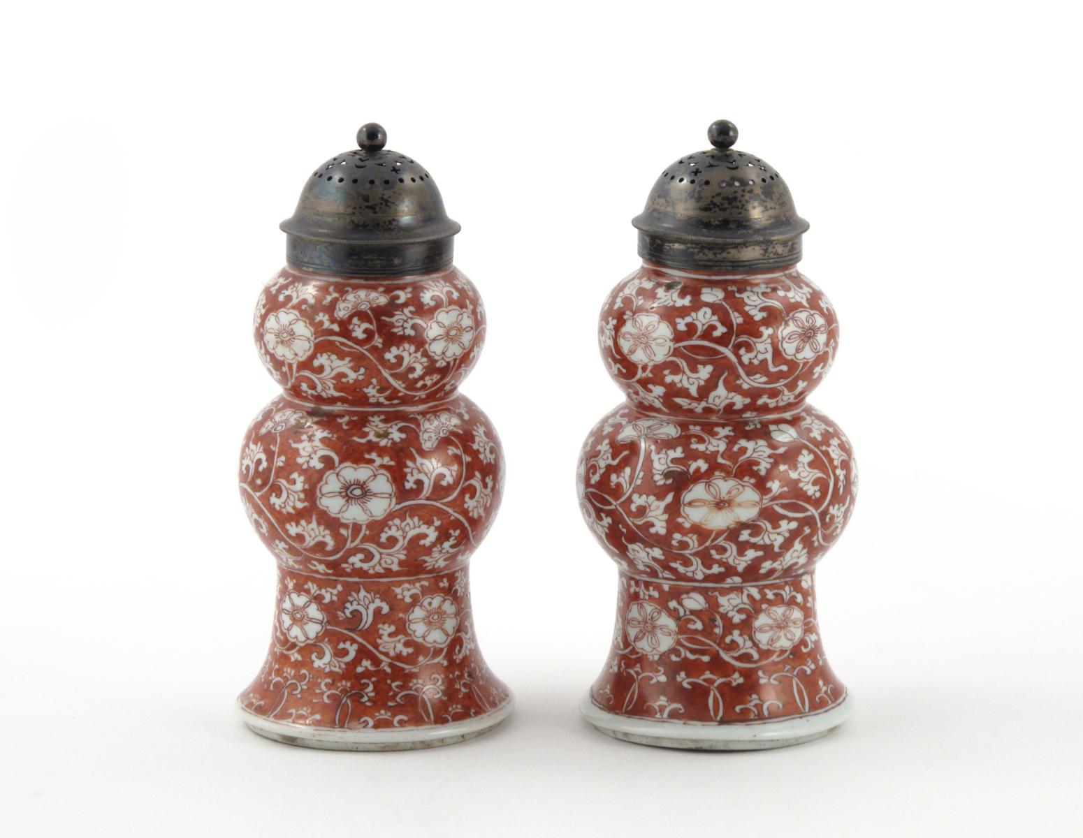 A pair of Chinese gourd-shaped vases Kangxi 1662-1722, each painted in iron-red with scrolling flowers and foliage, and cut down to accept silver-coloured sifter covers, 21cm. (4)