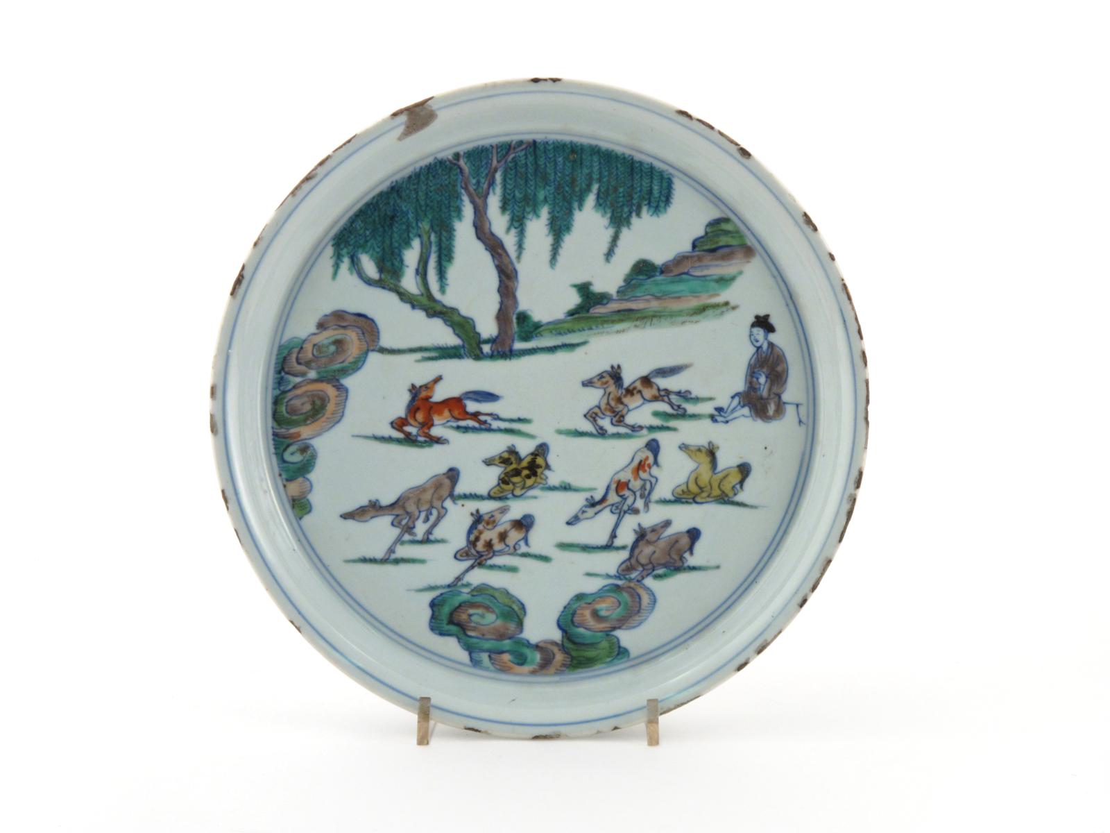 A Chinese doucai dish 17th century, painted with a single figure and the Eight Horses of Mu Wang beneath a willow tree, 26.5cm.