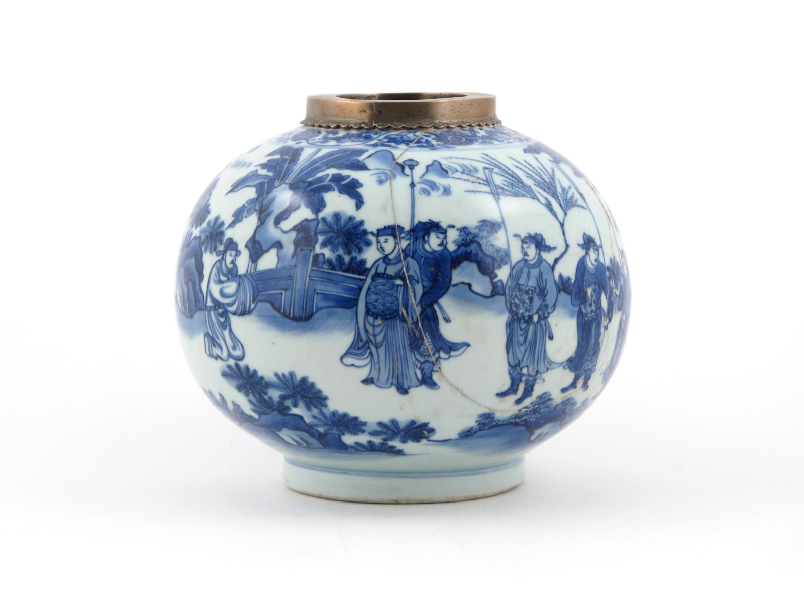 A Chinese blue and white reduced gourd-shaped vase c.1640, decorated with an official and his attendants in a rocky fenced garden, with plantain, pine and other trees beneath a scrolling foliate band within a double ring, the neck with a silver-coloured metal mount, 17.5cm.