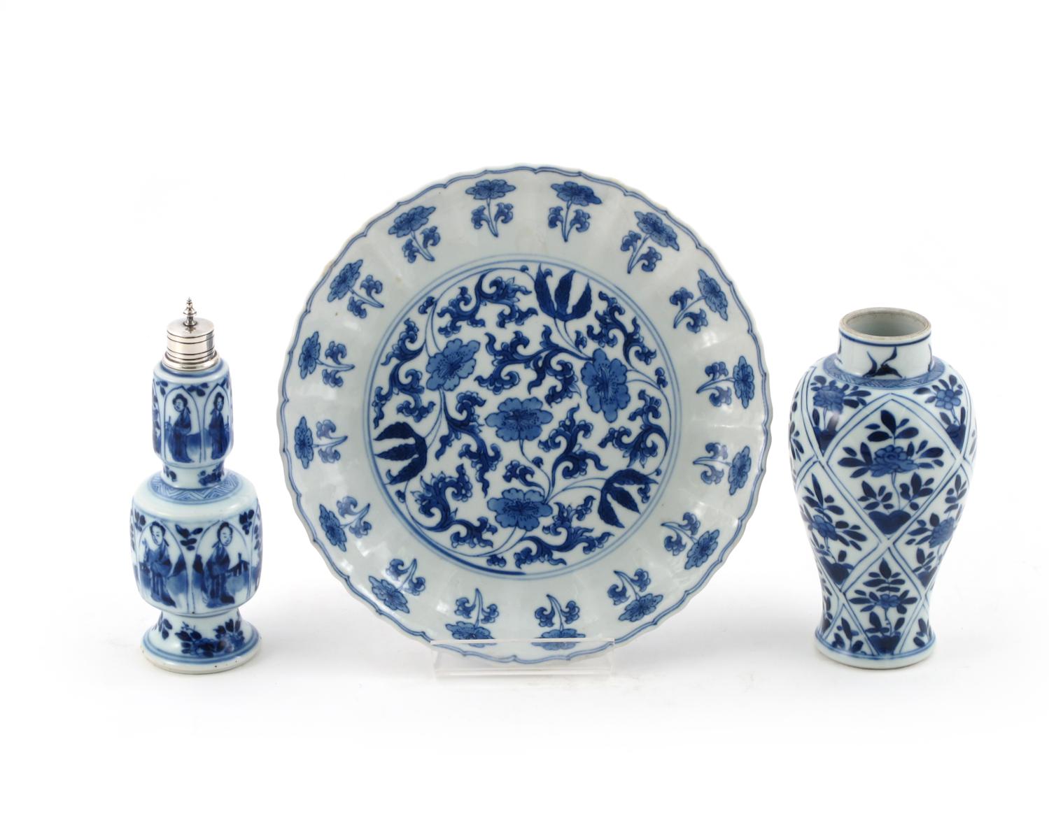 A Chinese blue and white dish Kangxi 1662-1722, painted with a scrolling lotus design, with a six character Chenghua mark, together with two small blue and white vases, one with a silver-coloured metal cover, 18.7cm. (4)