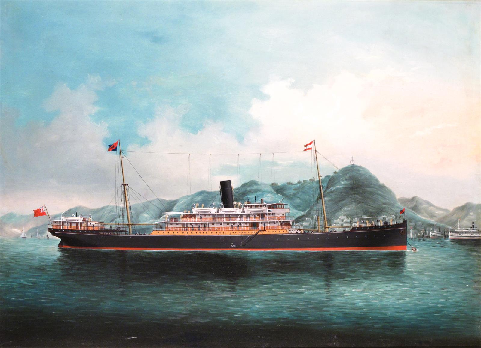 Chinese School c.1920 S.S. St. Albans moored in Hong Kong Harbour Oil on canvas 43 x 59cm; 17 x...