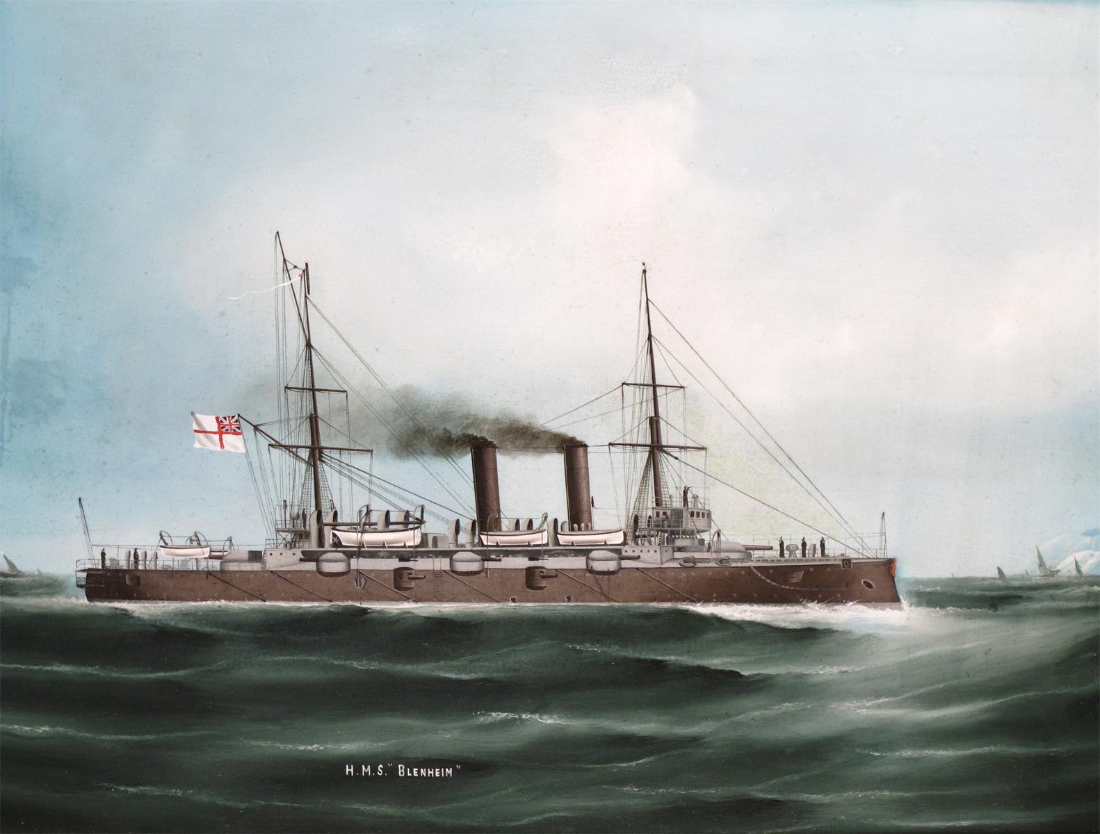 Chinese School c.1900 H.M.S. Blenheim near Hong Kong Oil on linen 45 x 59.5cm; 17¾ x 23½in...