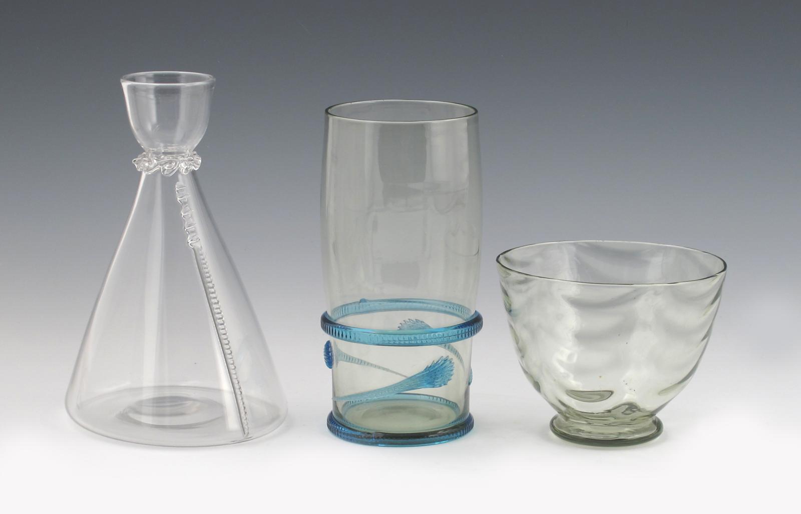 A James Powell & Sons Whitefriars glass Serpent vase, designed by Harry Powell, sea green glass with applied blue decoration, a claret bottle designed by Harry Powell, and a wave ribbed bowl designed by William Butler