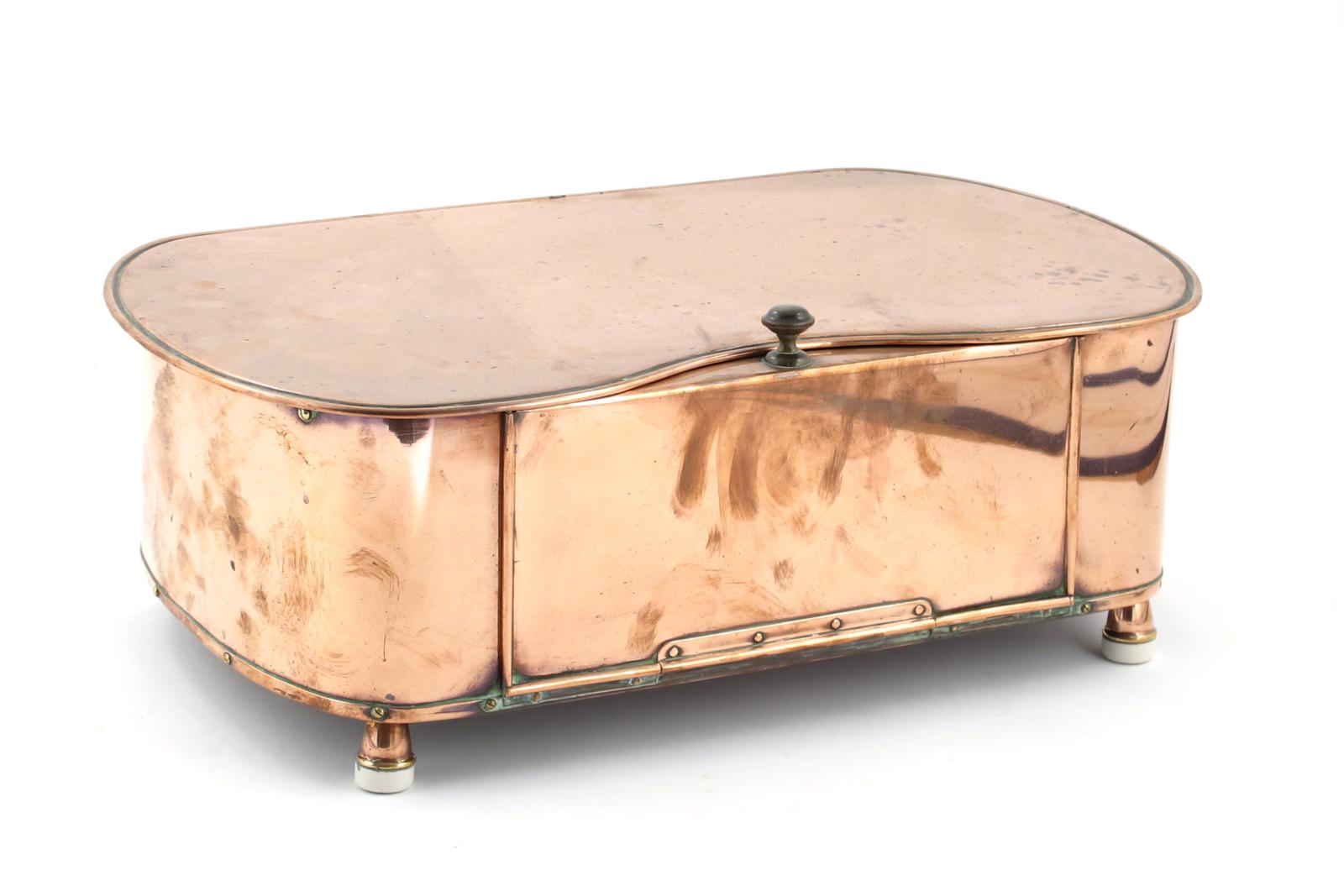 A William Arthur Smith Benson copper hot-plate, rounded, rectangular section on insulated feet, the front set with hinged door stamped mark 51cm. wide