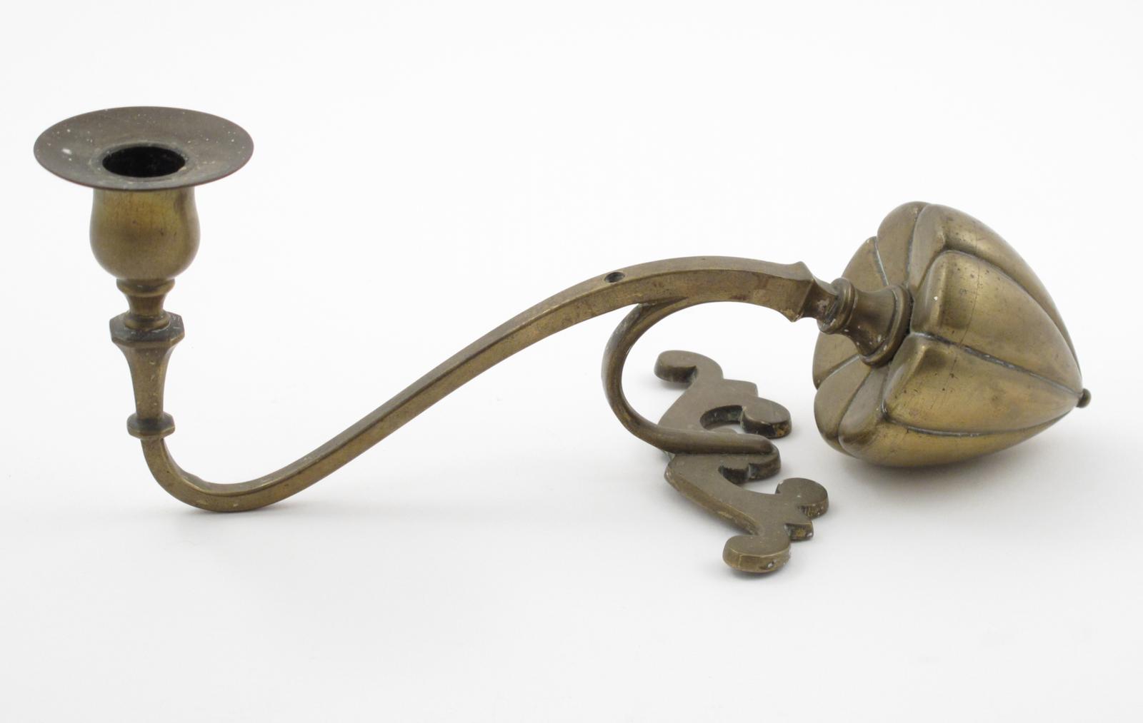 A William Arthur Smith Benson brass candlestick, scrolling stem with foliate feet, the circular sconce balanced with a seedpod counterweight unsigned 31cm. wide