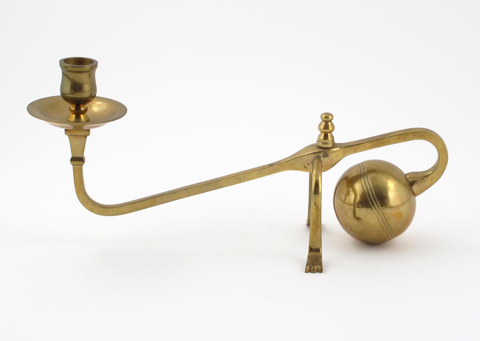 A William Arthur Smith Benson brass candlestick, model no.9, the mantle candlestick with ball counterweight, scrolling stem and cast arched feet, unsigned 31cm. wide