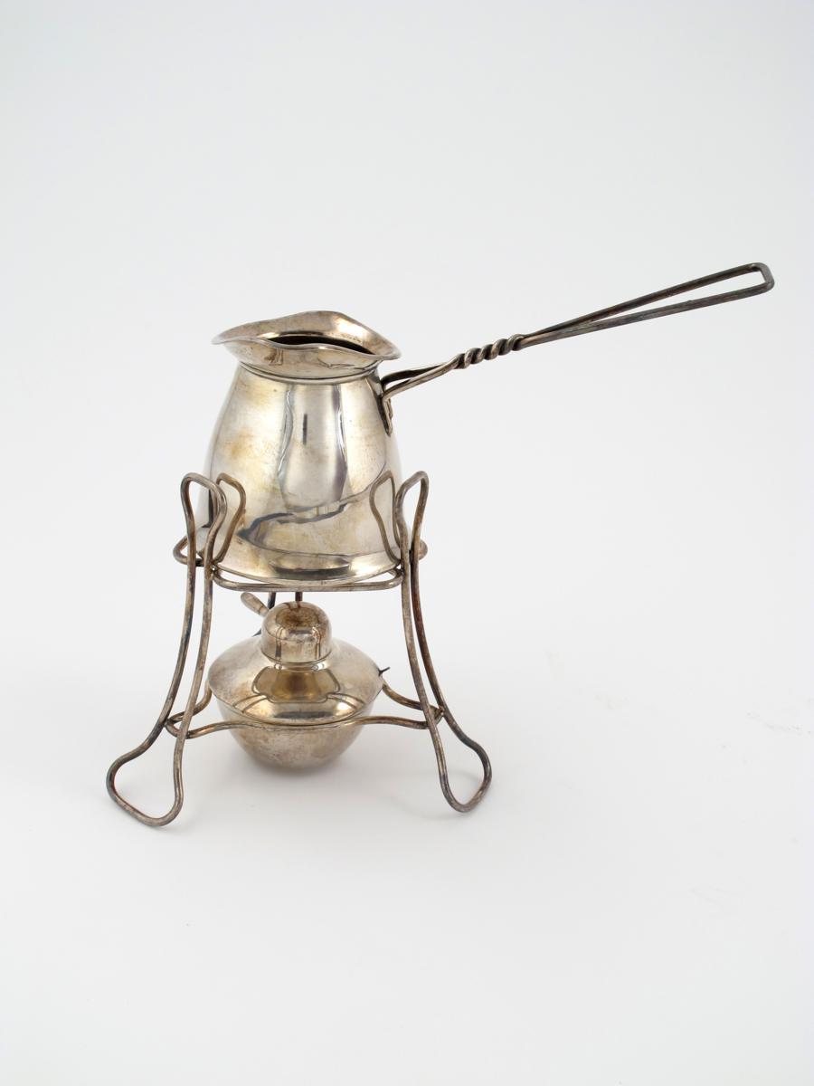 A William Arthur Smith Benson electroplate Turkish coffee pot, stand and burner, the wirework tripod stand holding burner, supporting coffee pot with wirework handle stamped WASB & Co mark to coffee pot 20.5cm. high