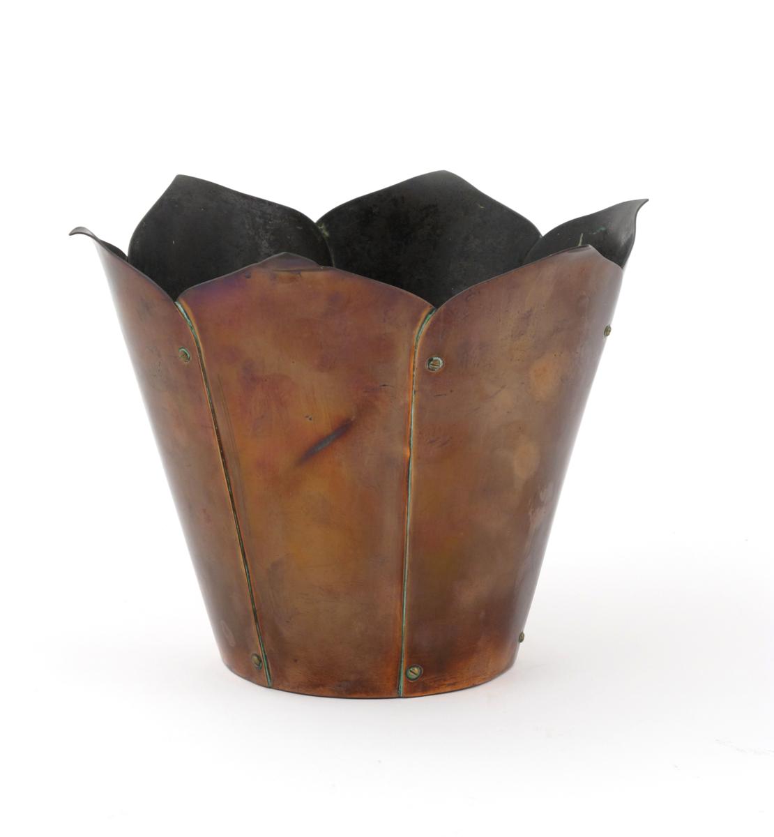 A William Arthur Smith Benson copper flower pot, shape no.626, simple floriform with six flaring petals with brass screws and brass base plate unsigned 18cm. high