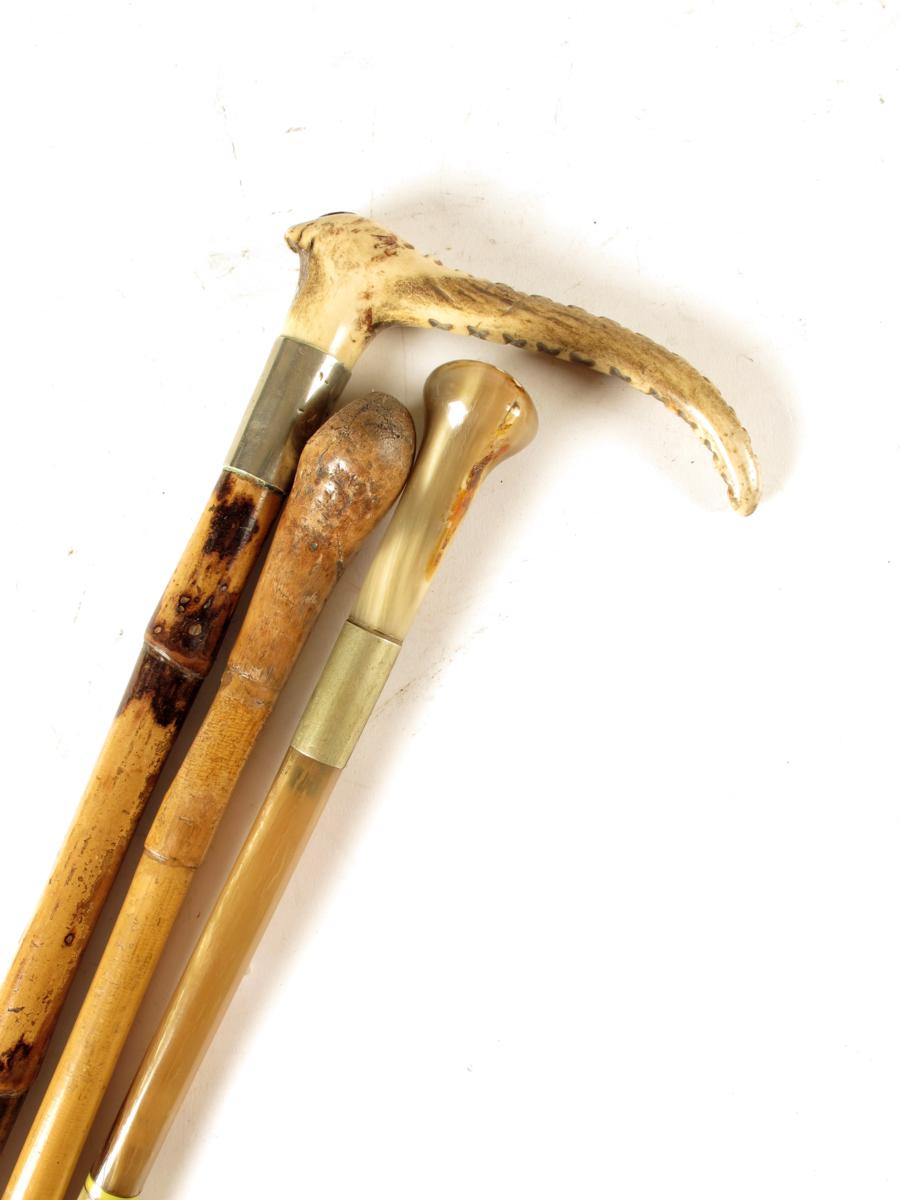 A segmented horn and brass mounted swagger stick, inscribed 'GWADA 1958 FIROZ NOON', 25in (63.3cm) long and two bamboo and leather riding crops. (3)