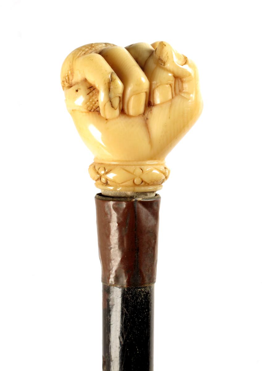 An ebonised walking cane, the ivory handle carved as a fist clenching a snake, 32in (81.3cm) long.