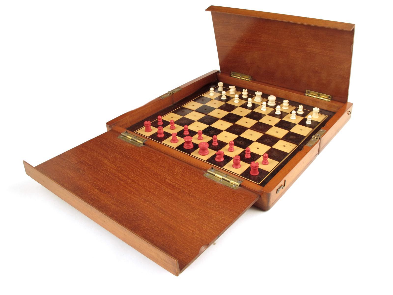 A mahogany cased travelling chess set, the folding case with carved bone pieces, natural and stained red, with a rosewood and planewood board, late 19th / early 20th century, 2¾in (6.7cm) high, 12in (30.4cm) wide, 6in (15.1cm) deep, closed.