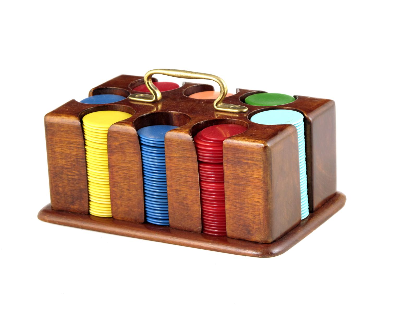 A set of coloured plastic gaming counters, in a mahogany frame with brass handle, 4in (10cm) high, 8in (20.3cm) wide.