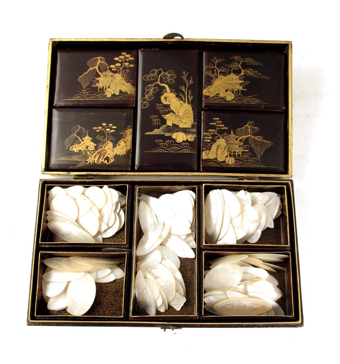 A 19th century Chinese lacquer games box, decorated in gilt with pagoda landscapes, the interior with five lidded boxes containing a quantity of Chinese mother of pearl gaming counters, 11in (28cm) wide.