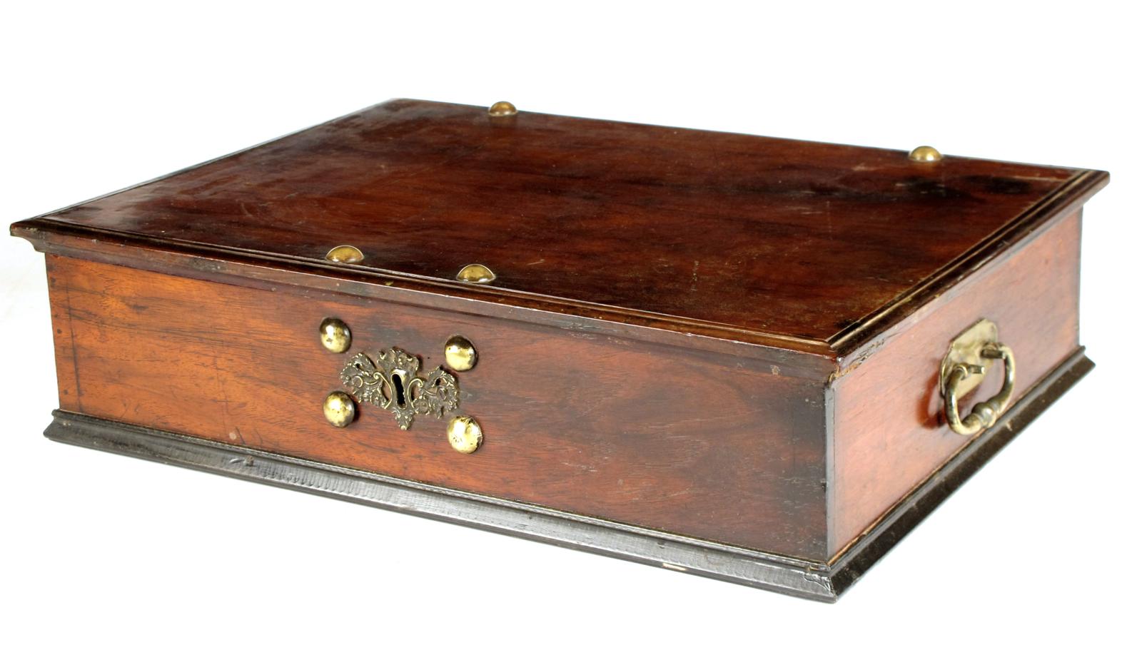 An 18th century Dutch colonial teak and ebonised writing box, probably Sri Lanka, with brass mounts, handles and strapwork hinges, the interior with a brass inkwell, pounce pot and a pen division, 5½in (13.9cm) high, 22½in (56.8cm) wide, 16½in (41.8cm) deep.