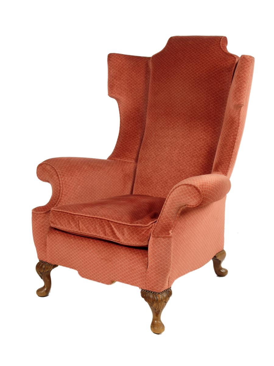 A wing armchair in early 18th century style, on carved walnut front legs, late 19th century.
