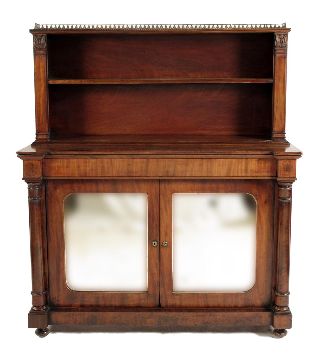 A George IV mahogany chiffonier, with a cast gilt brass leaf gallery, and a cedar lined frieze drawer above a fixed shelf enclosed by a pair of replaced mirrored panel doors, 55in (139.7cm) high, 47in (119.5cm) wide, 18in (45.7cm) deep.