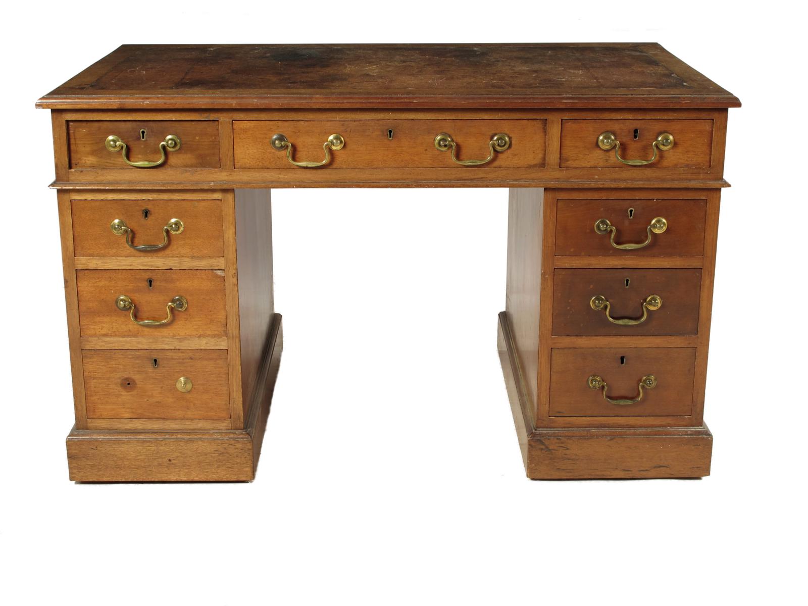 A late Victorian mahogany twin pedestal desk, with nine drawers fitted replaced brass handles, 29½in (74.5cm) high, 48in (121.5cm) wide, 27¾in (70.3cm) deep.