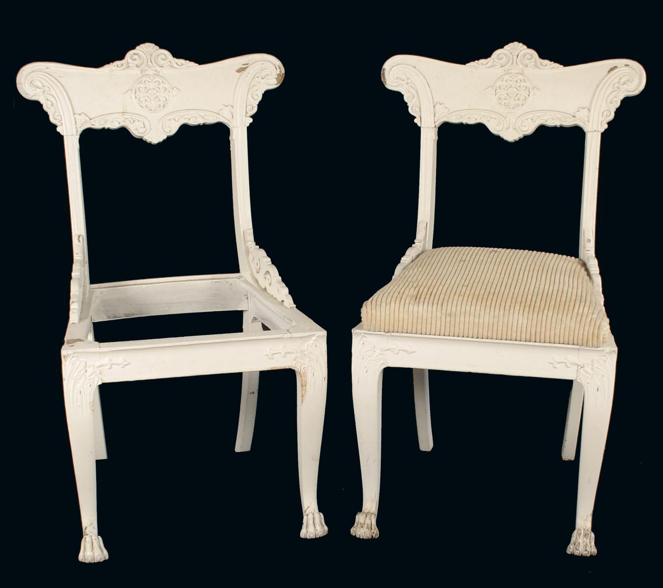 A pair of Regency carved and later white painted side chairs, with leaf scroll and lappet decoration, on carved paw front feet. (2)