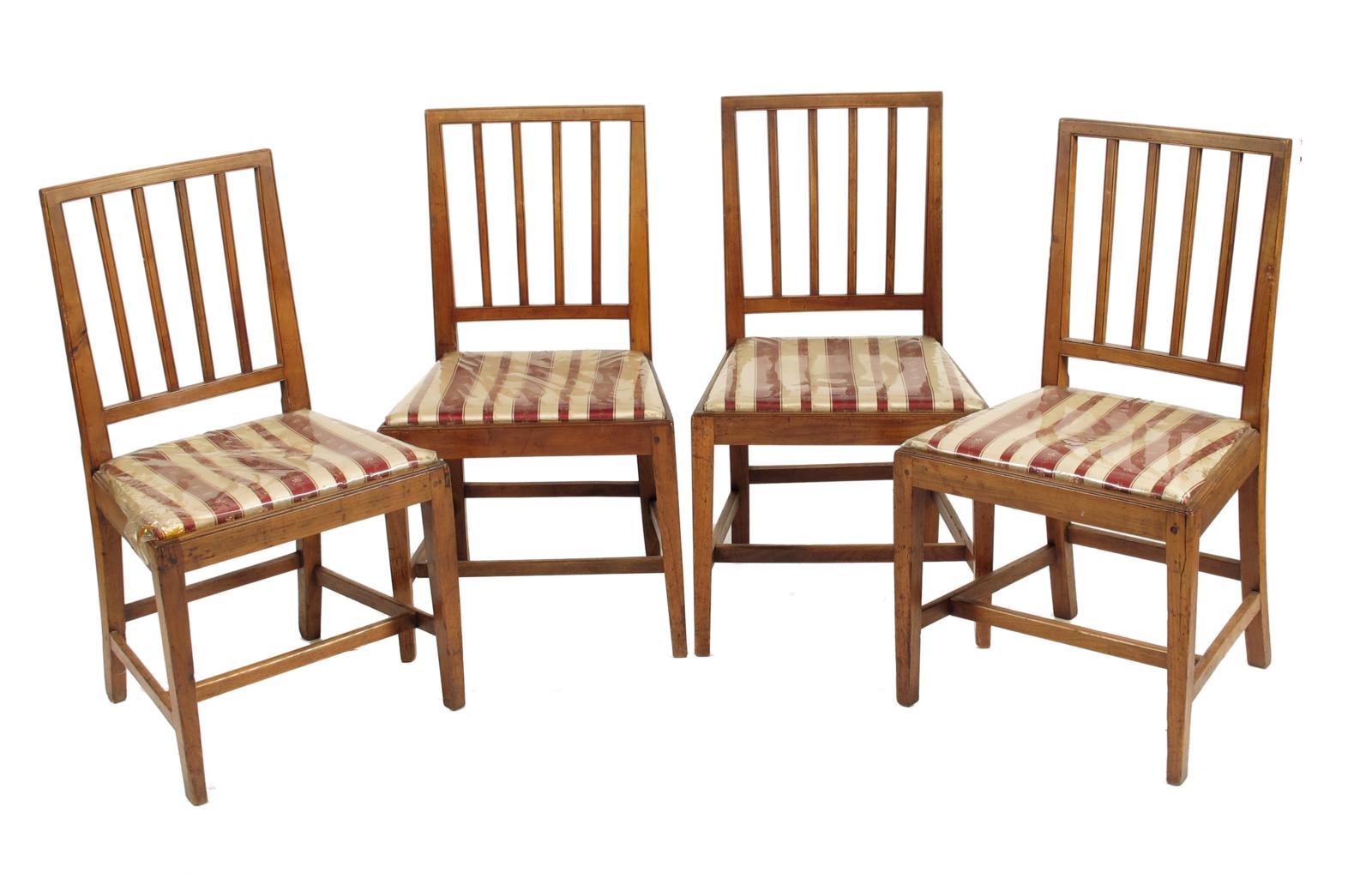 A set of four early 19th century fruitwood side chairs, each with a later drop-in seat. (4)