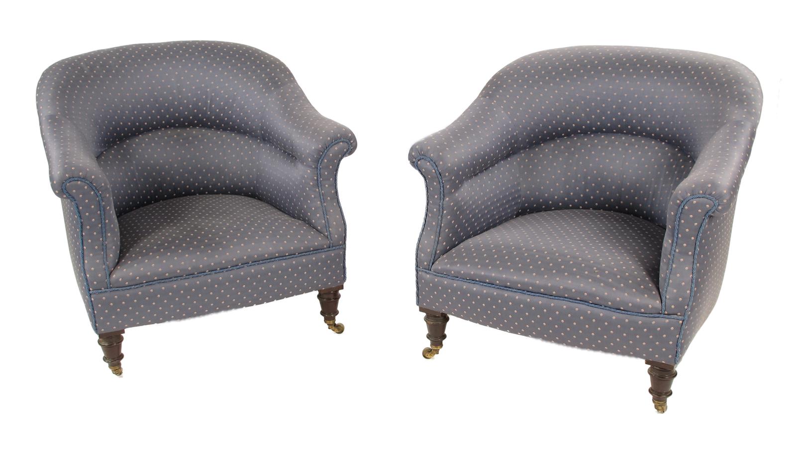 A pair of Victorian tub armchairs, later upholstered on turned mahogany front legs and brass castors. (2)