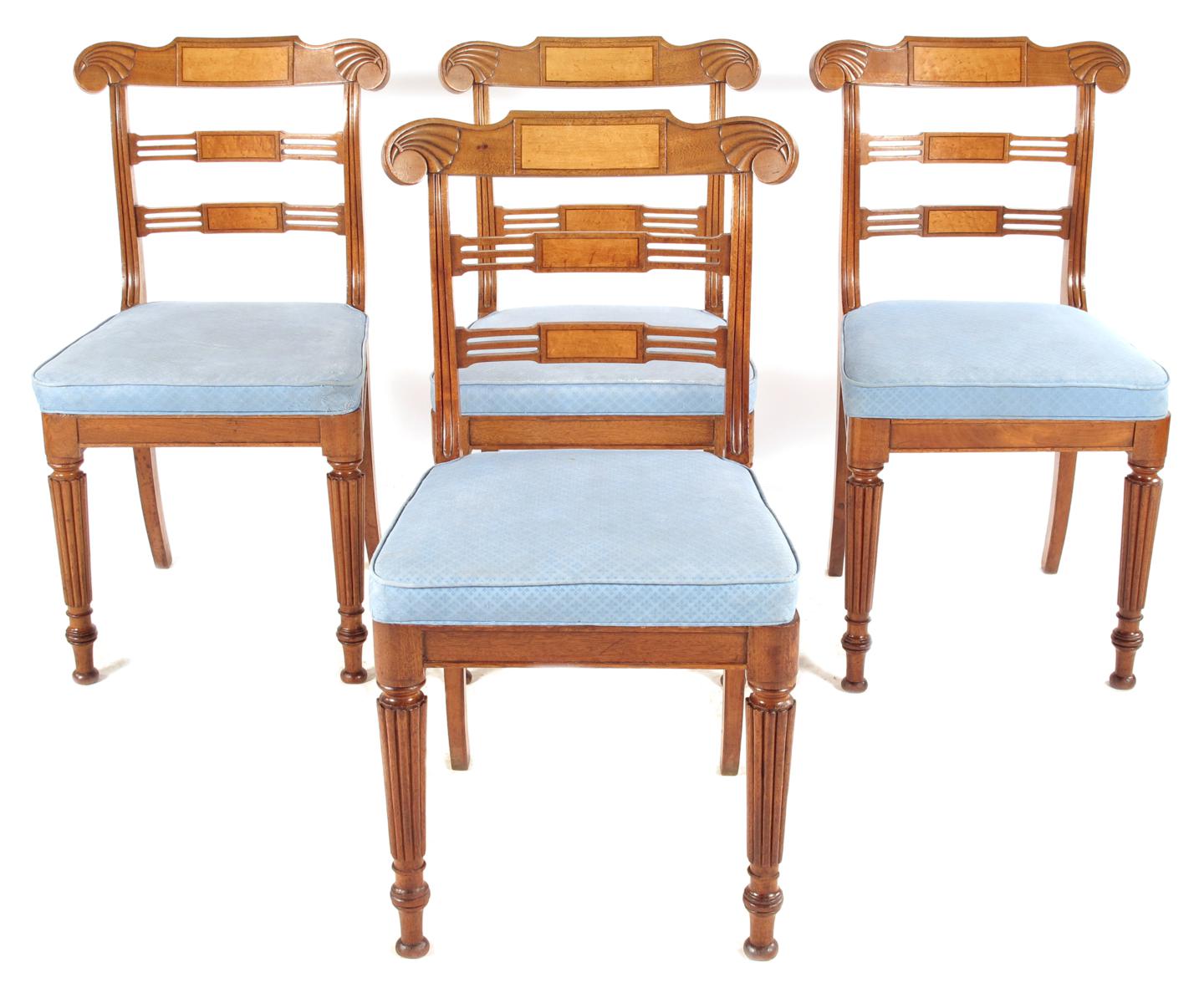 A set of four 19th century mahogany side chairs, with bird's eye maple panels, each with a drop-in seat on ribbed front legs. (4)