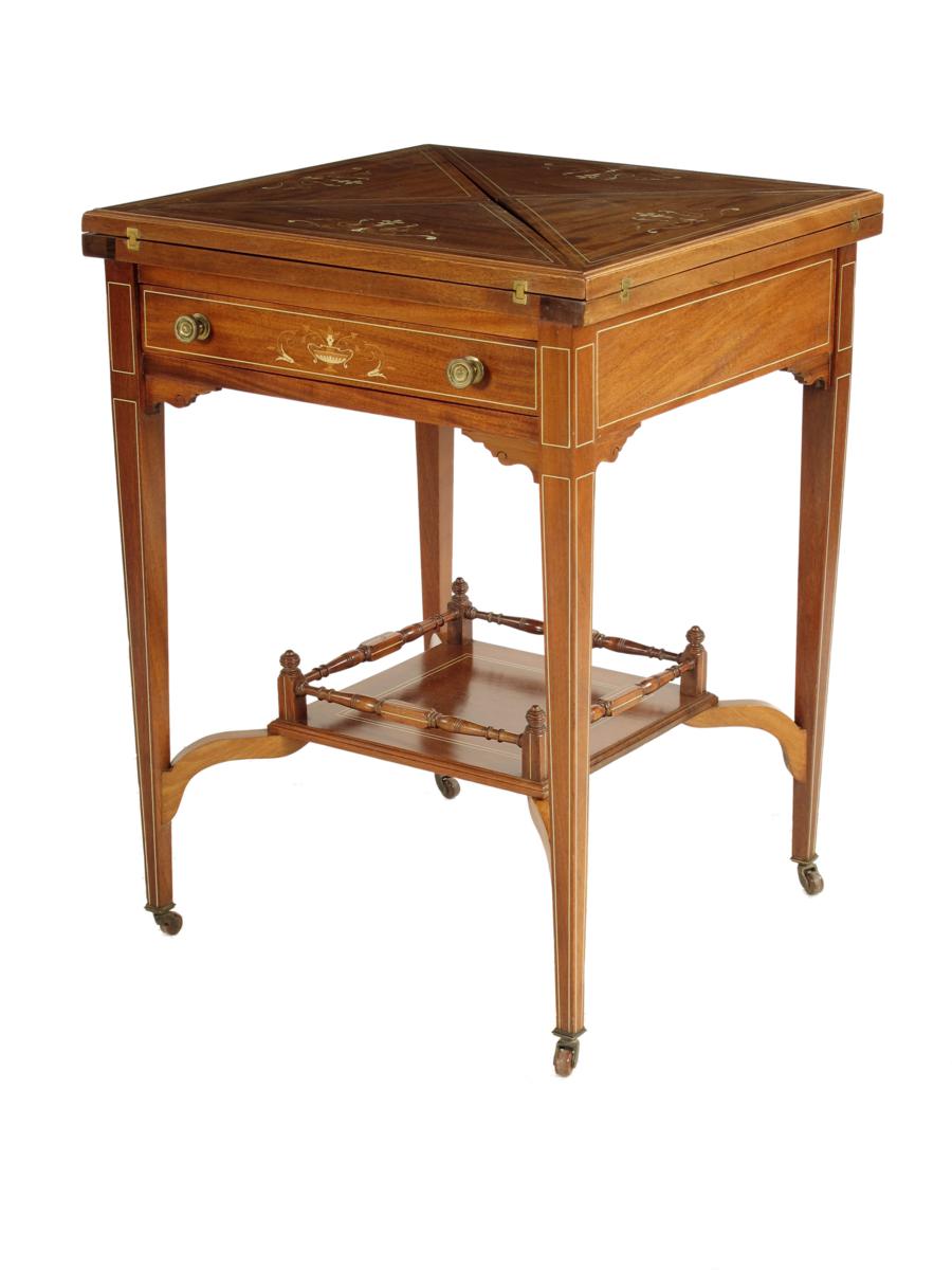 A late Victorian mahogany and marquetry envelope card table, with a frieze drawer and with an undertier, 29¼in (74cm) high, 21¾in (55cm) square.