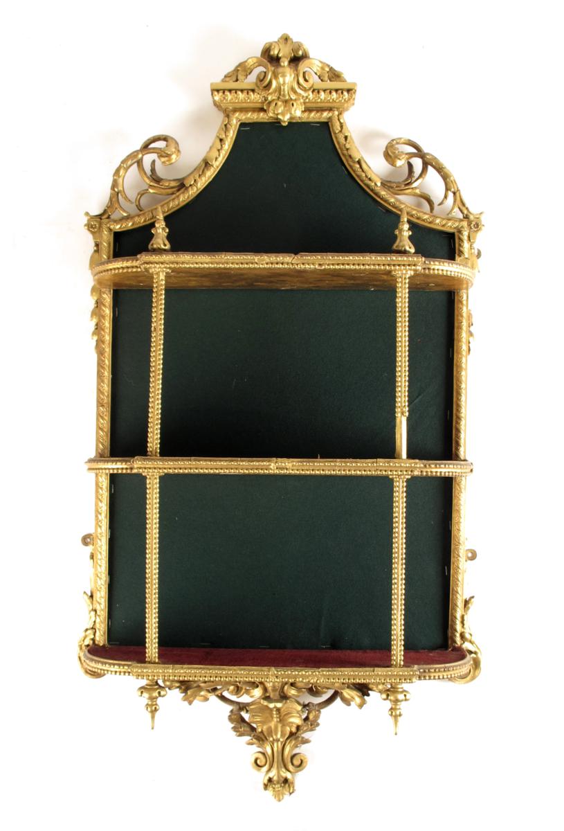 A late 19th century giltwood and gesso wall shelf, having three tiers and with scroll foliage decoration, originally with a mirror back, 39½ x 21in (100.5 x 53.5cm).