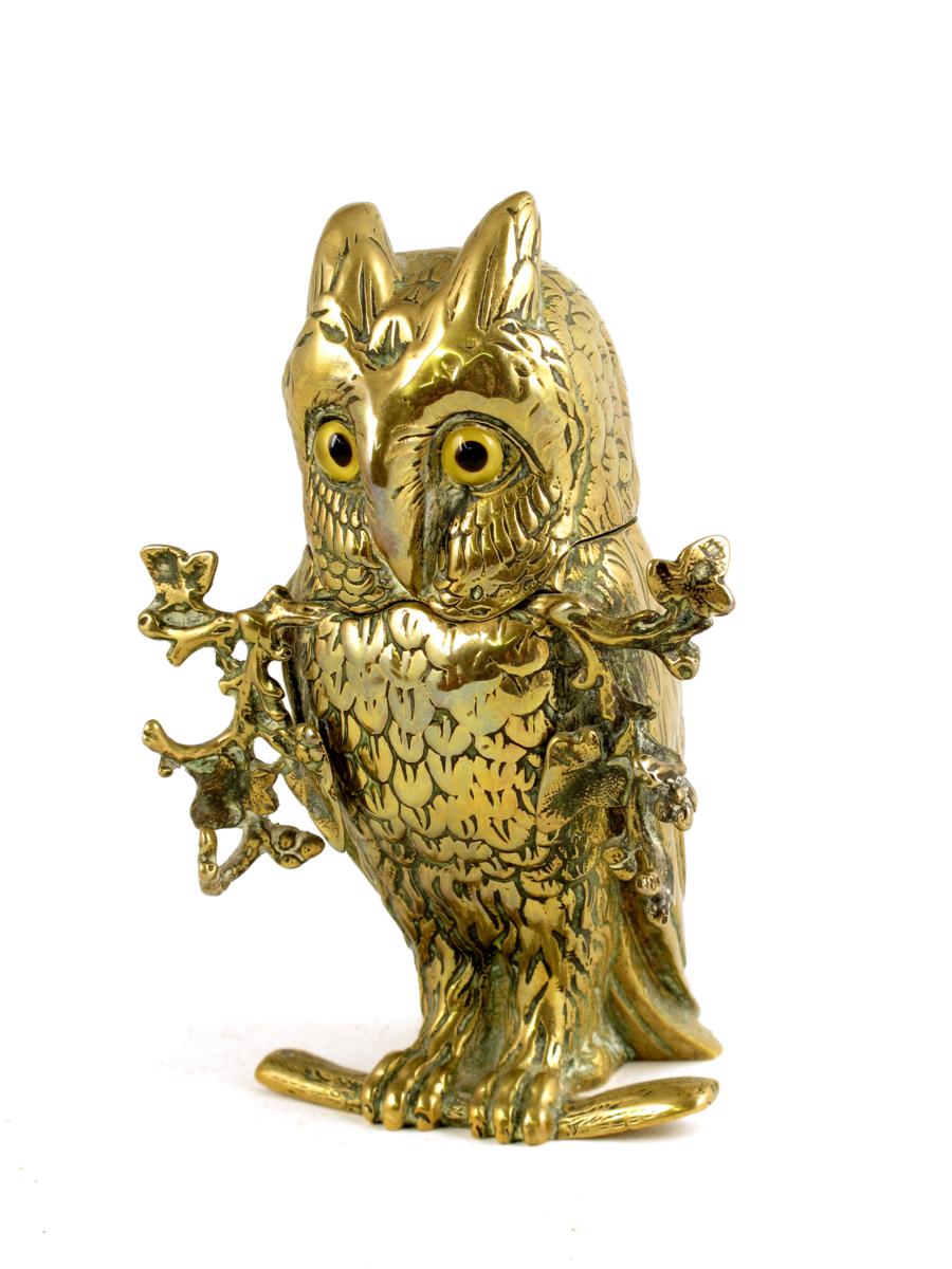 A late Victorian brass owl inkwell, with glass eyes, the head hinged to a vacant interior, the foliage as a pen rest, 5½in (14cm) high, 3¾in (9.3cm) wide.