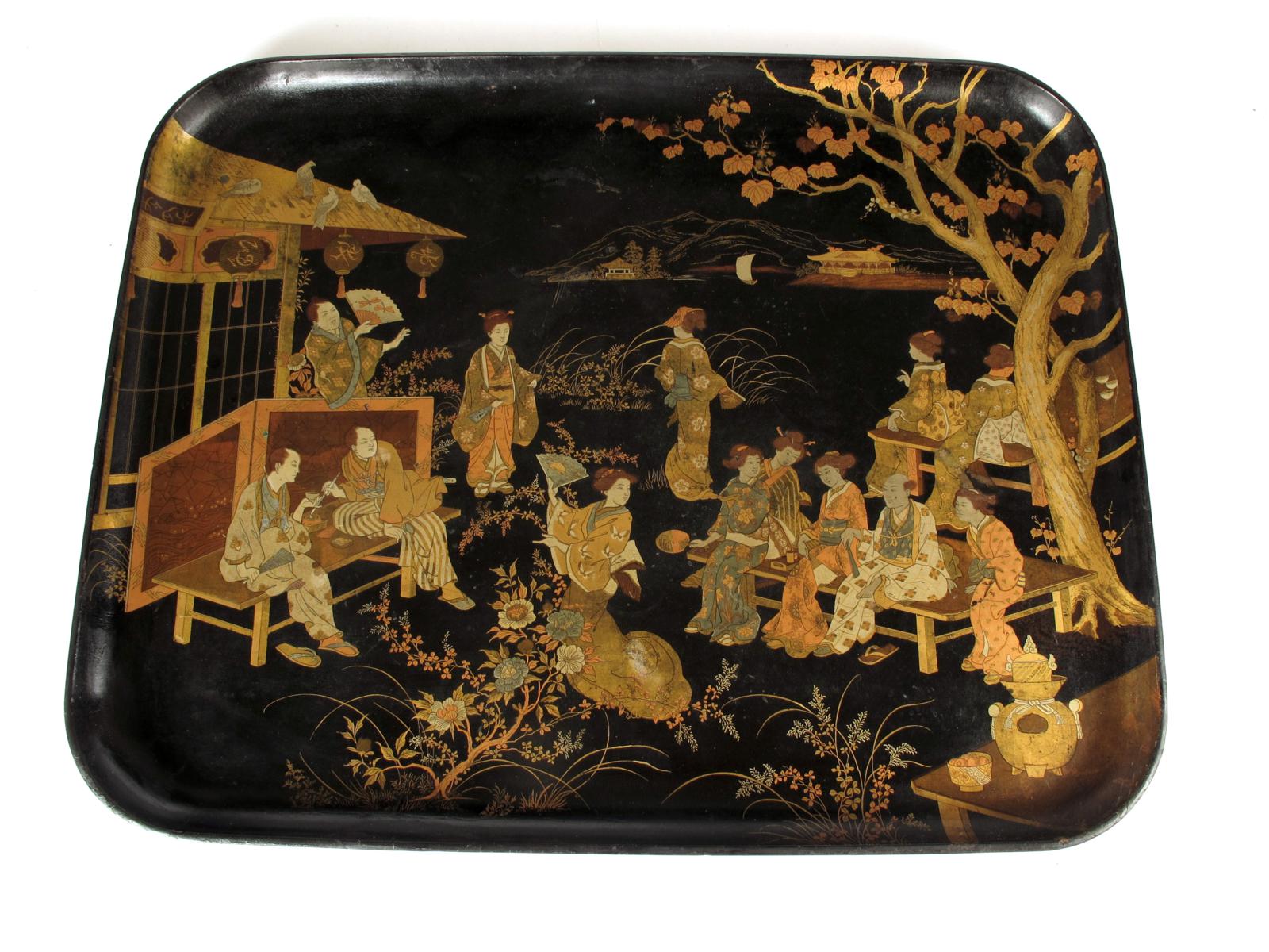 A late 19th century French papier-mâché tray, gilt decorated in Japanese style, 22 x 28in (55.7 x 70.8cm).