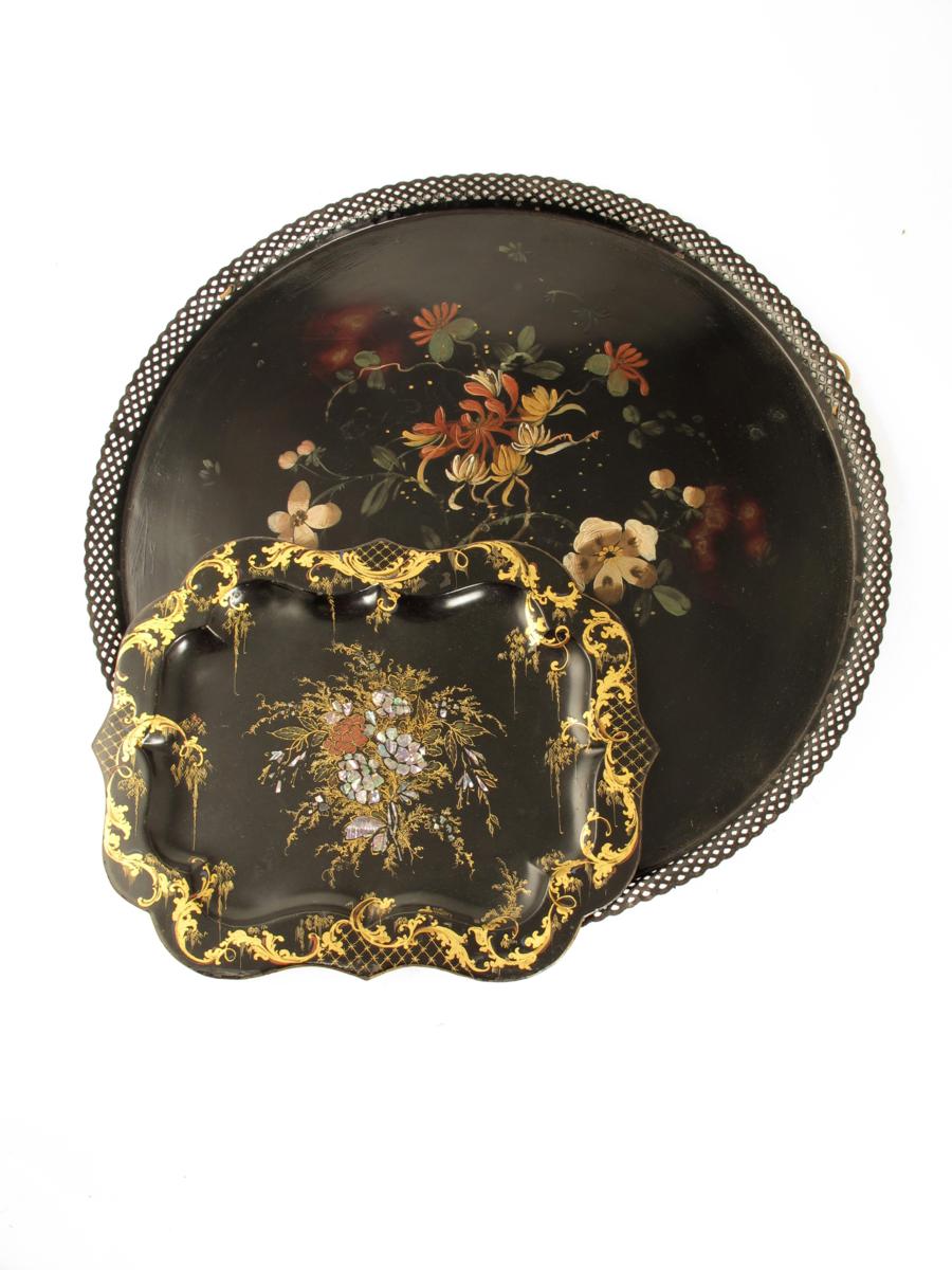 Two 19th century tôle trays, one with a pierced rim, the other with gilt and mother of pearl decoration, 20in (51cm) diameter, max. (2)