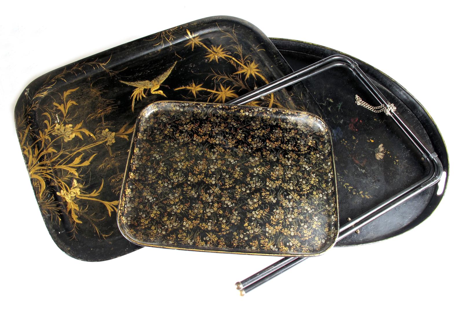 A 19th century French tôle peinte chinoiserie tray, the reverse stencilled '72 Ctres', 21¾ x 28in (55 x 71cm), an oval galleried tole tray and a later folding stand. (3)