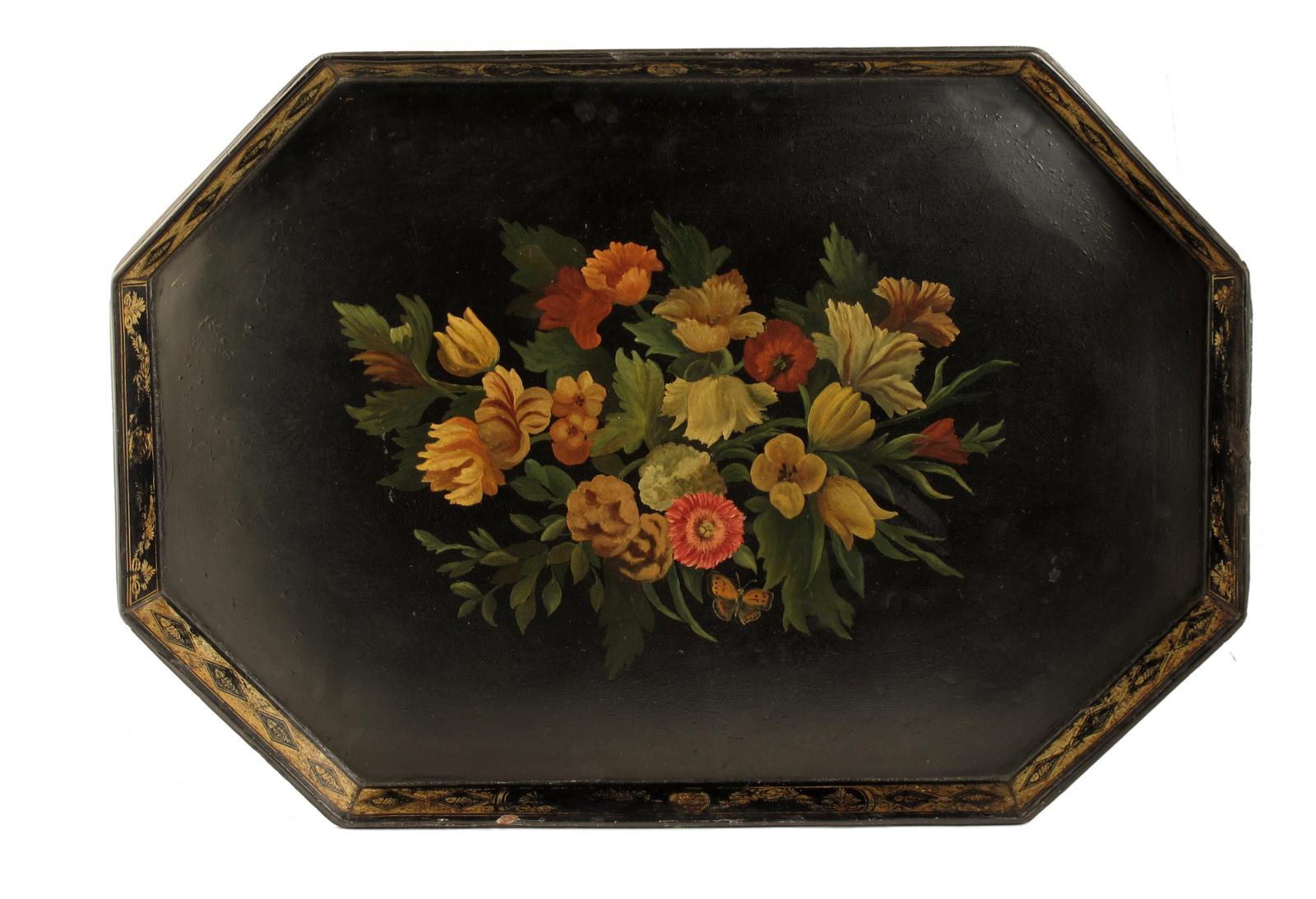 An early Victorian papier-mâché galleried tray, the rim decorated in gilt to a painted centre of flowers and a butterfly, 21 x 30.5in (53.4 x 77.4cm).