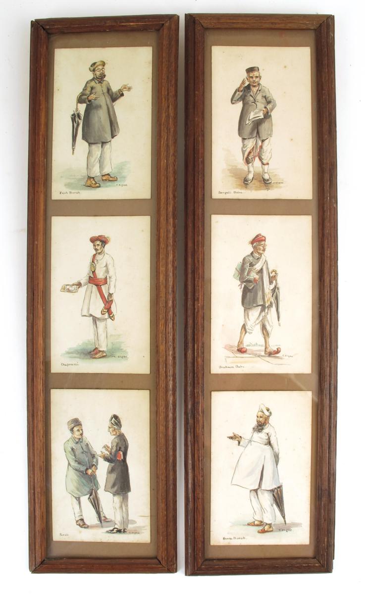 Cecil Elgee (late 19th / early 20th century). Six pen and watercolour studies possibly for 'Costumes and Characters of the British Raj' illustrated by Elgee and written by Evelyn Battye, each titled and signed 'C. Elgee', 5½ x 3½in (13.6 x 8.5cm), three framed as one, glazed. (2)