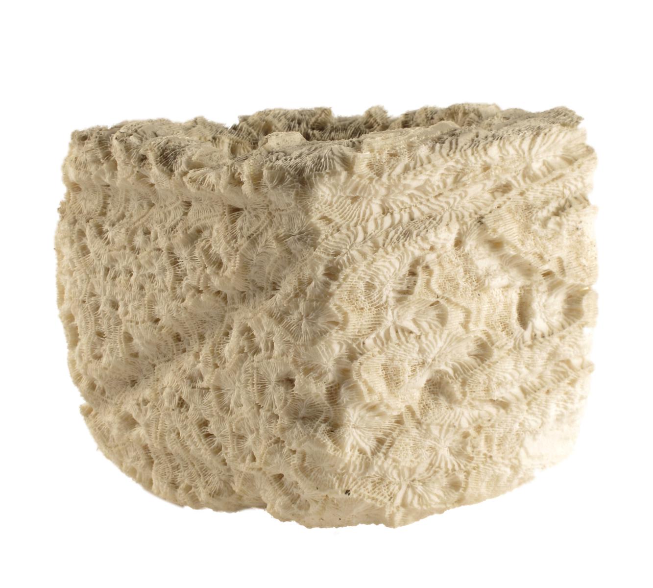 A carved coral square vessel, possibly Cook Islands, with typed label 'Presented by Dr. L.R.Lempriere,' 5¼in (13.2cm) high, 6in (15cm) square.