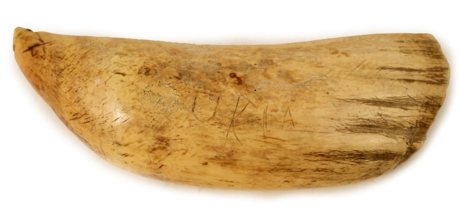 A Fiji sperm whale tooth, incised URIA, each end with pierced holes, 7½in (19cm) long.