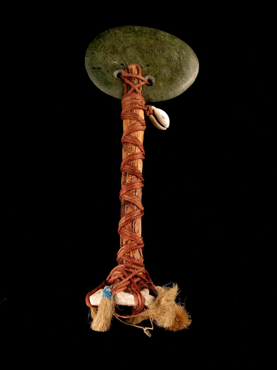New Caledonian type ceremonial sceptre, with a greenstone oviod top, rope bound to a rattan stem and covered disc base, 13.25in (30.3cm) h.