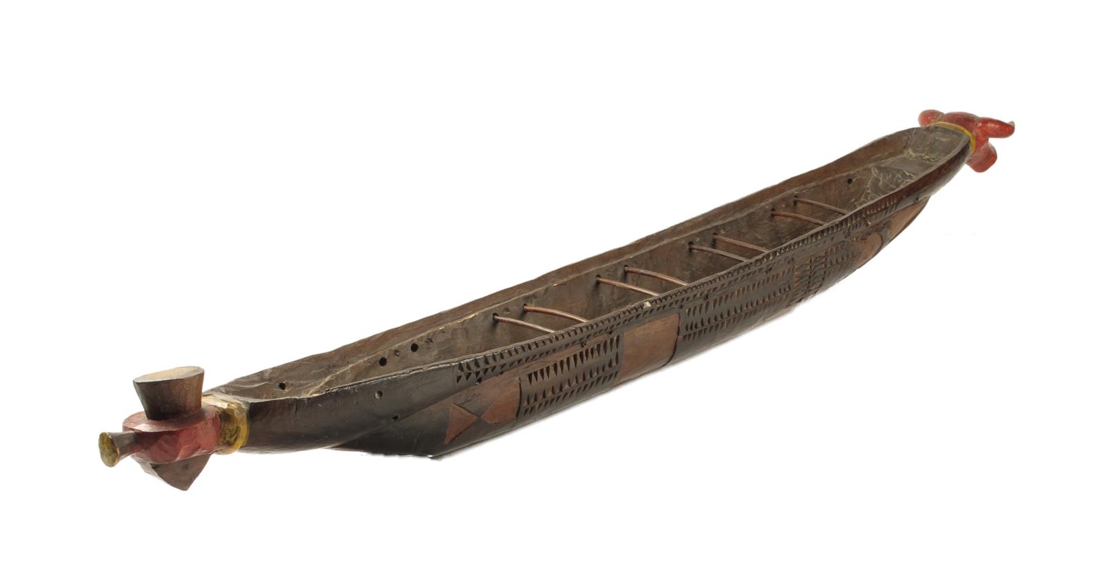 A model canoe, with polychrome decorated bull head prow, the sides with geometric carving including a shark, on later supports, 51in (129.5cm) long.