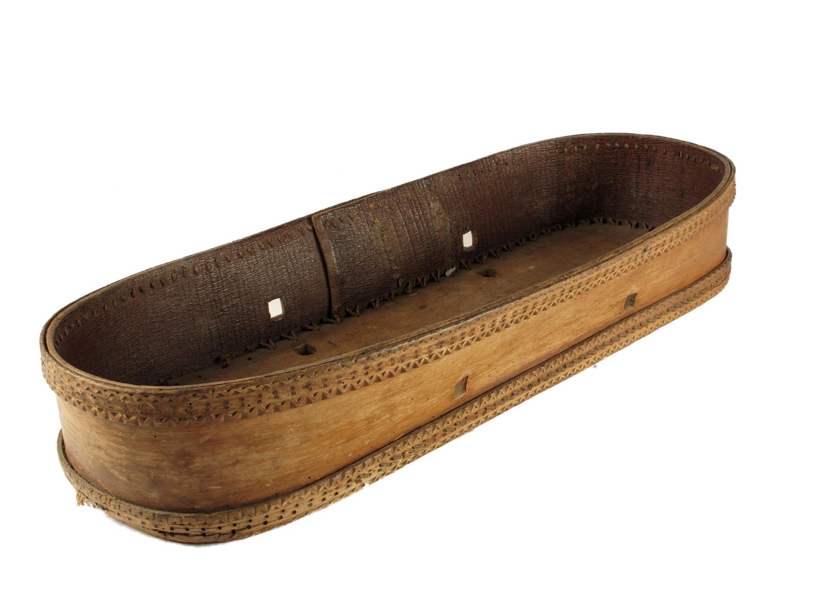 A North American maple cradle, with bark sides and a part pierced base, 5in (12.6cm) high, 29in (73.6cm) long.