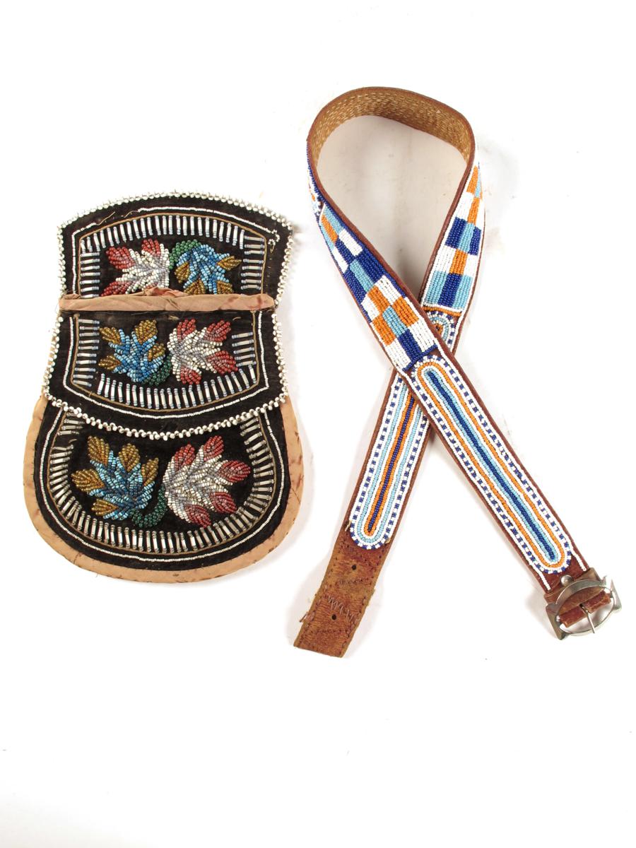 A North American beadwork purse, floral decorated both sides, 7½in (19cm) high and a leather and beadwork belt. (2)
