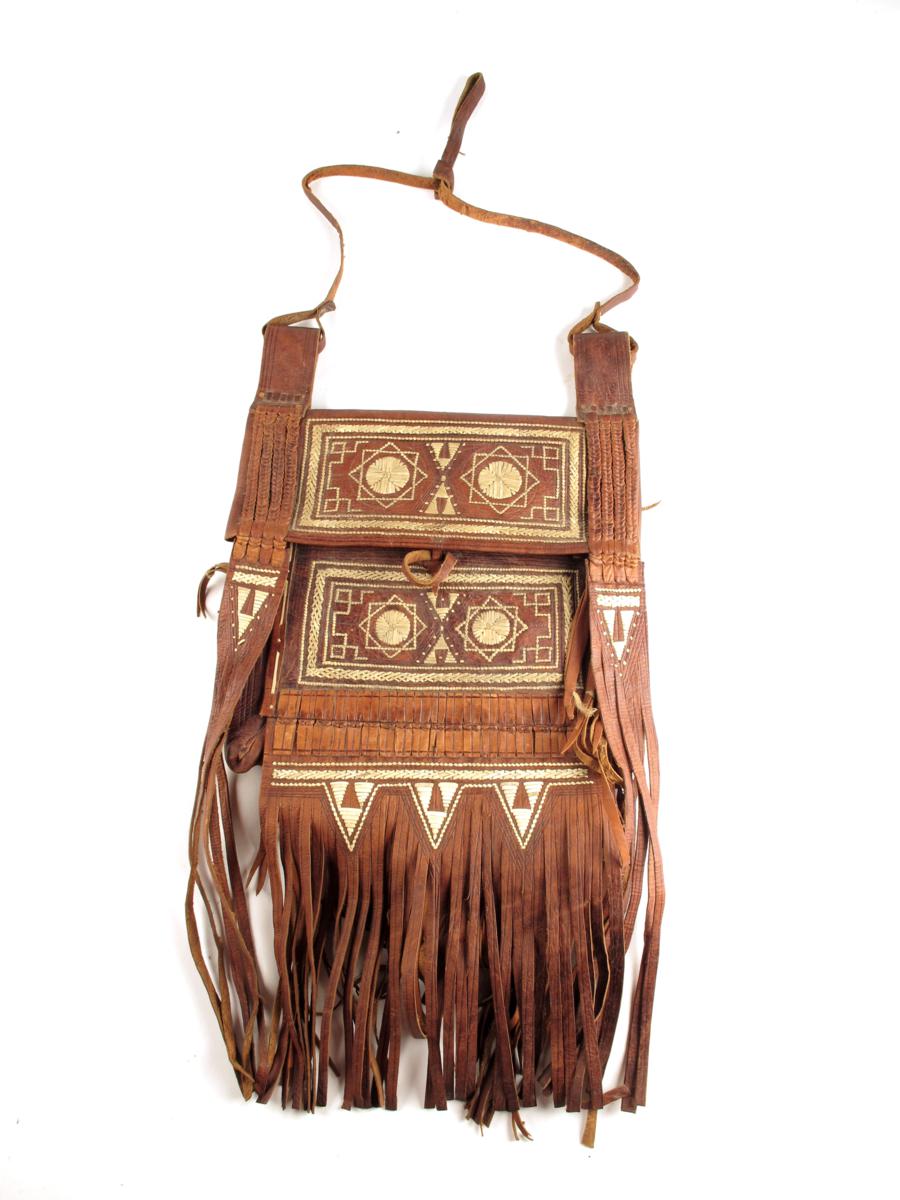 A Native American leather saddle bag, with vellum stitched decoration, with top flap and side pocket, 12½in (32cm) wide.