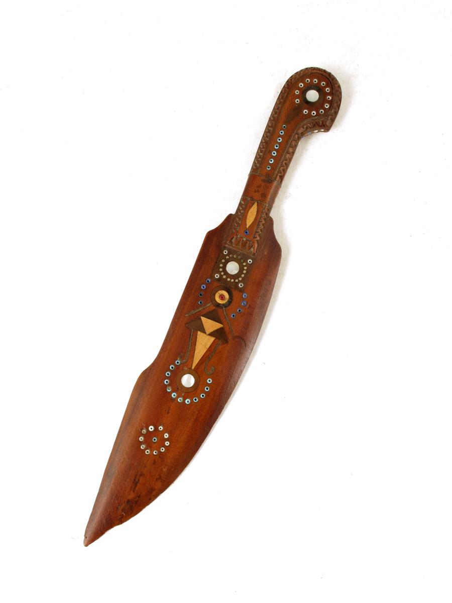 A North American ceremonial wood knife, with a notched carved handle and inlaid beads, mother of pearl and specimen woods, 9½in (24cm) long.