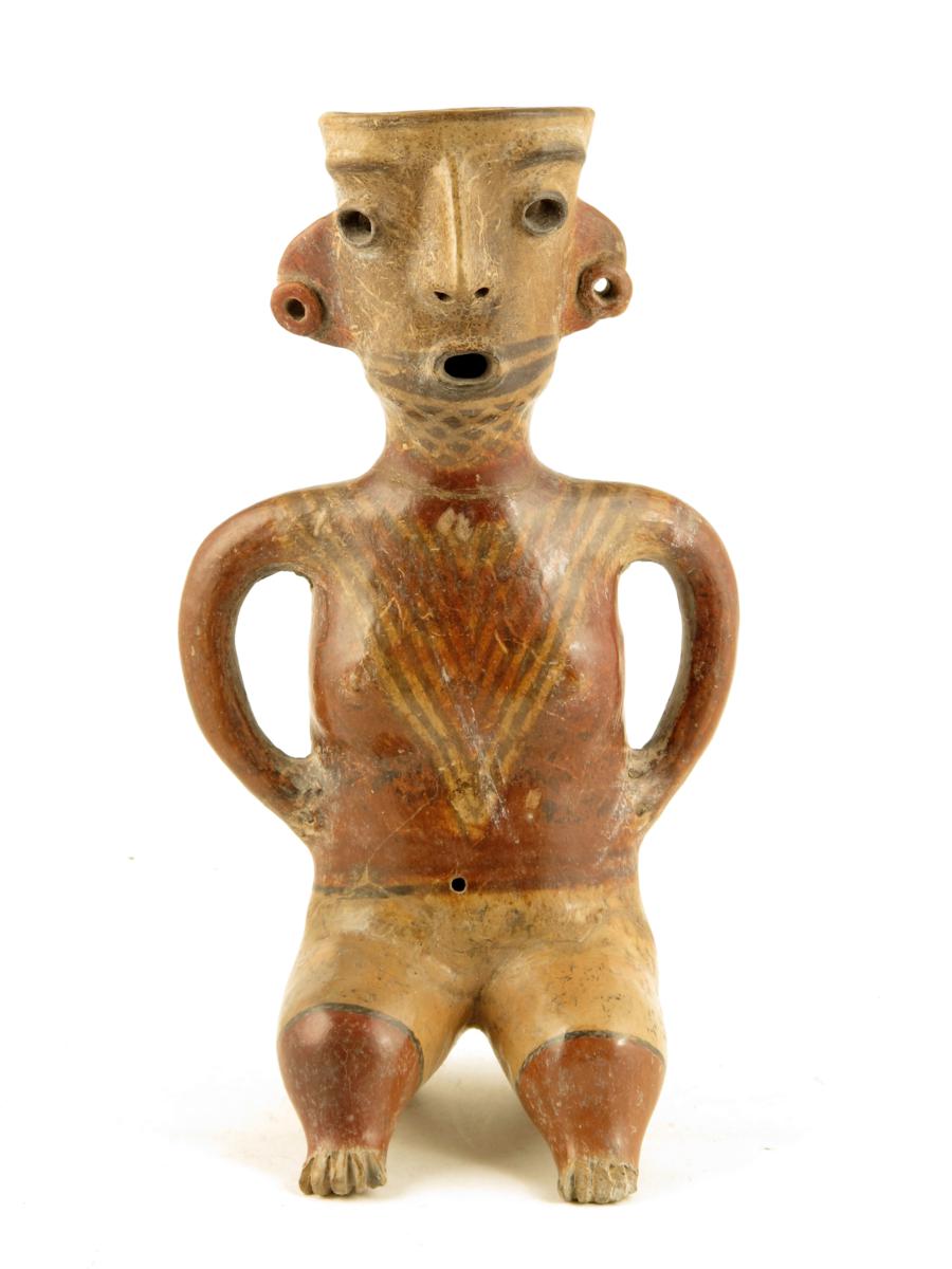 A Zacatecas pottery seated female figure, with disc earring and hands resting on hips, black, cream and red/brown decoration, 13¾in (35cm) high.