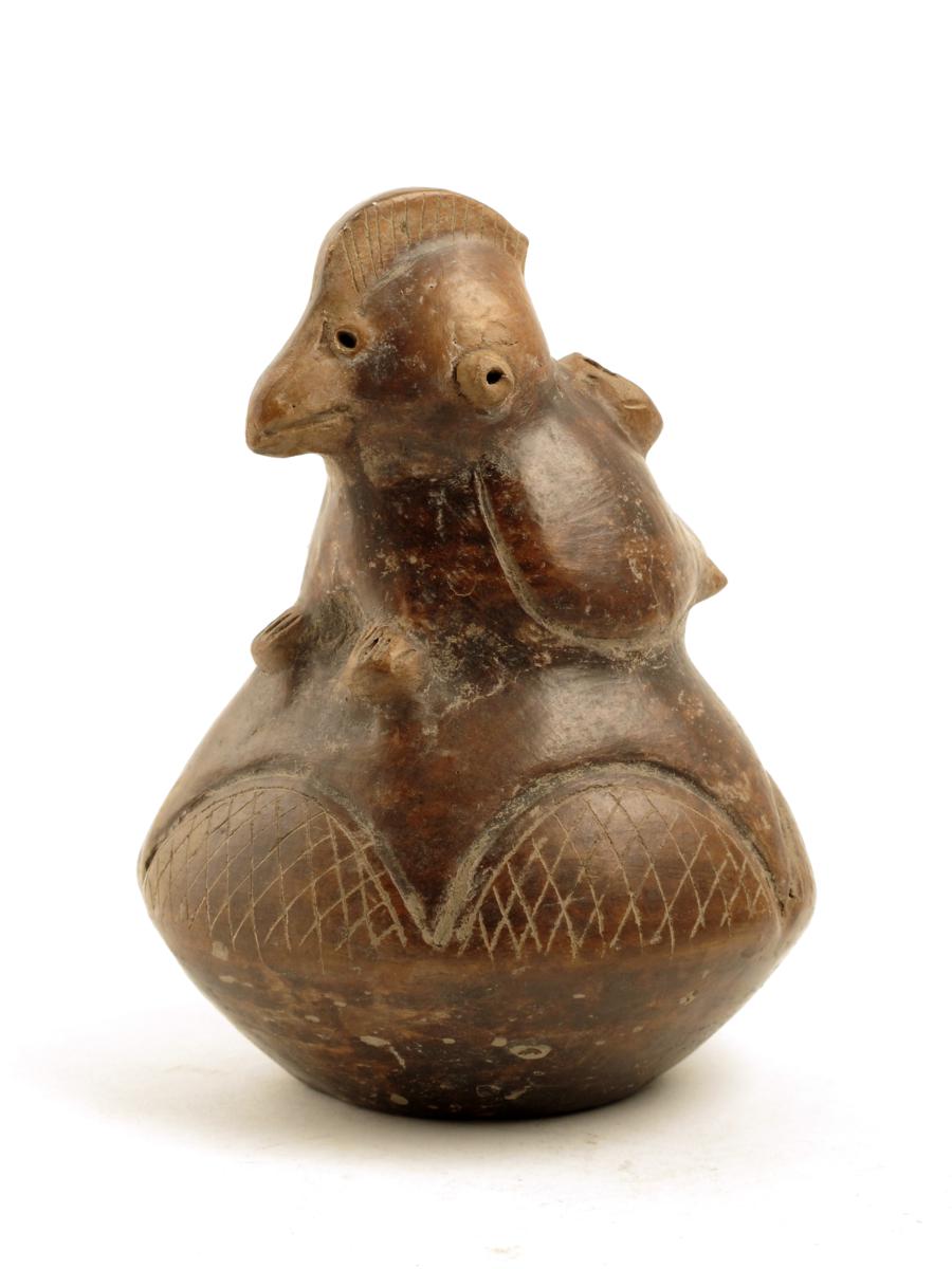 A South American pottery vessel, of globular form with a perched bird mount, with a circular aperture to the back, 7½in (19cm) high.