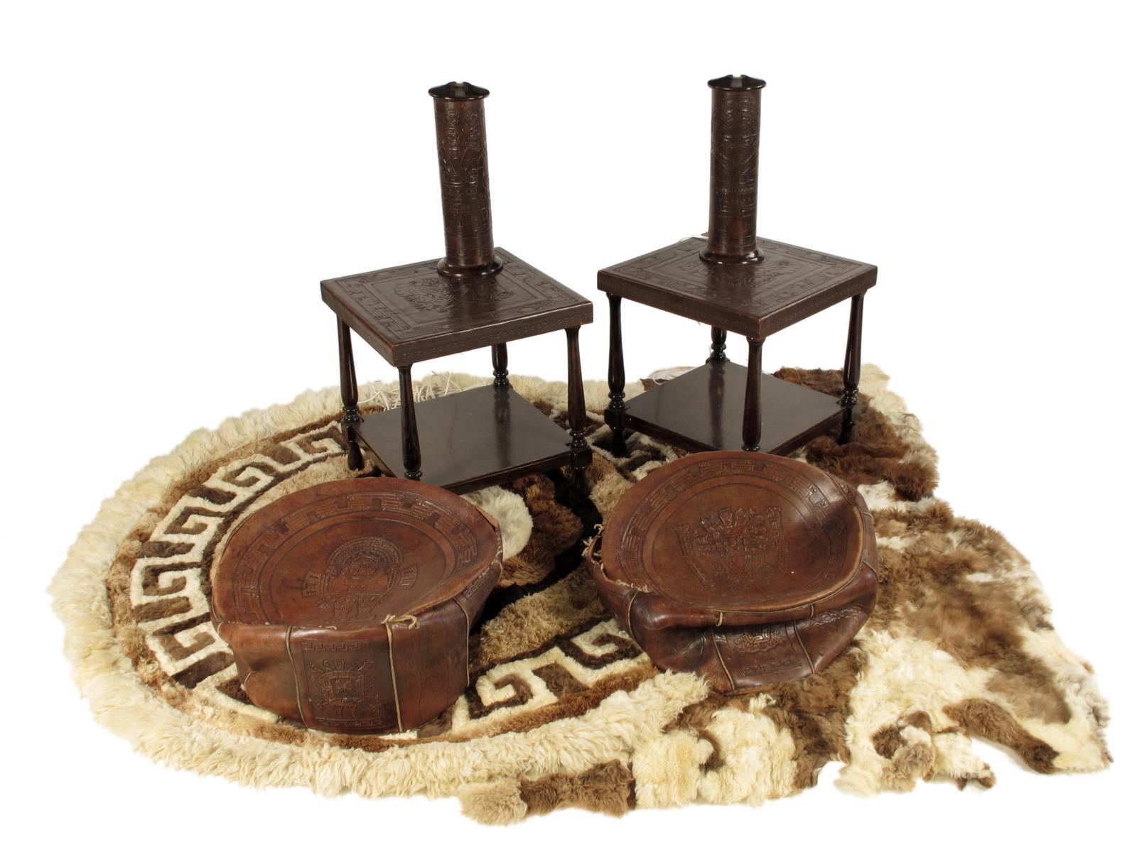 A pair of embossed leather cylindrical lamps, 17¼in (44cm) high, a pair of occasional tables, 20in (51cm) high, 19in (48cm) wide and two pouffes, 22in (56cm) diameter. (6)