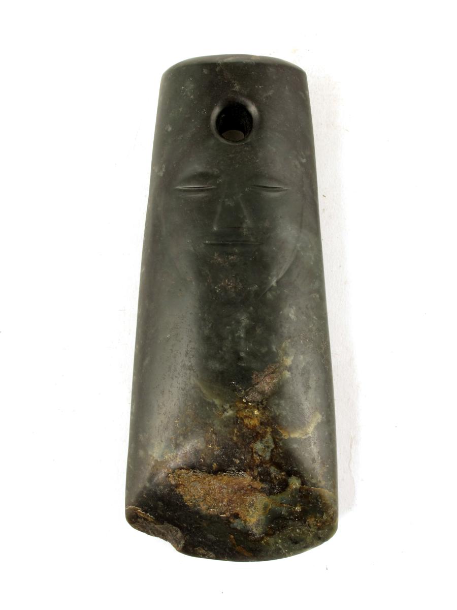 A pre Columbian jade axe head, each side with a low relief carved mask, 7½in (19cm) long.
