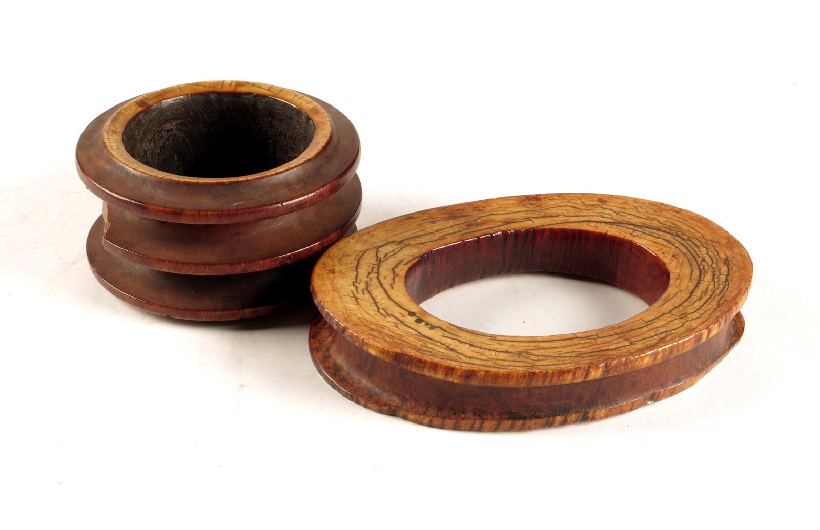 A Naga ivory circular bangle, with triple fins, chipped, 4¼in (11cm) diameter and another of oval form with a single flute, 6½in (16.5cm) wide. (2)