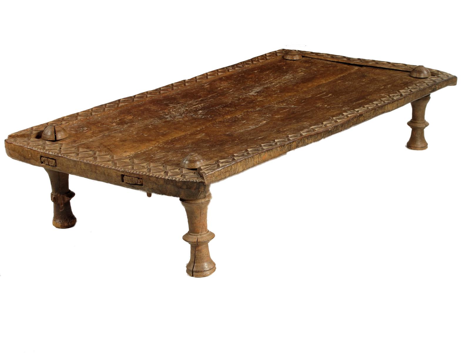A Tibetan high Lama's bed, with a two board top with a carved border, on turned legs, 14in (35.5cm) high, 63in (160cm) long.