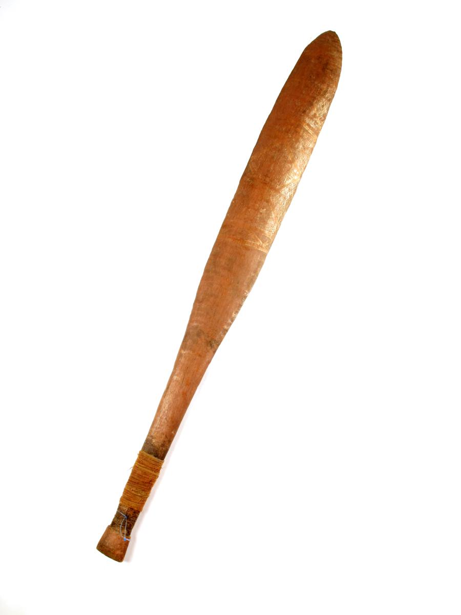 An Aboriginal tiwi, with a red ground and painted geometric decoration, with a part cloth bound handle, 37¼in (94.5cm) long.