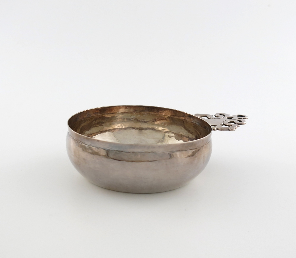 circular bowl, pierced handle, length 16cm, approx. weight 5oz.