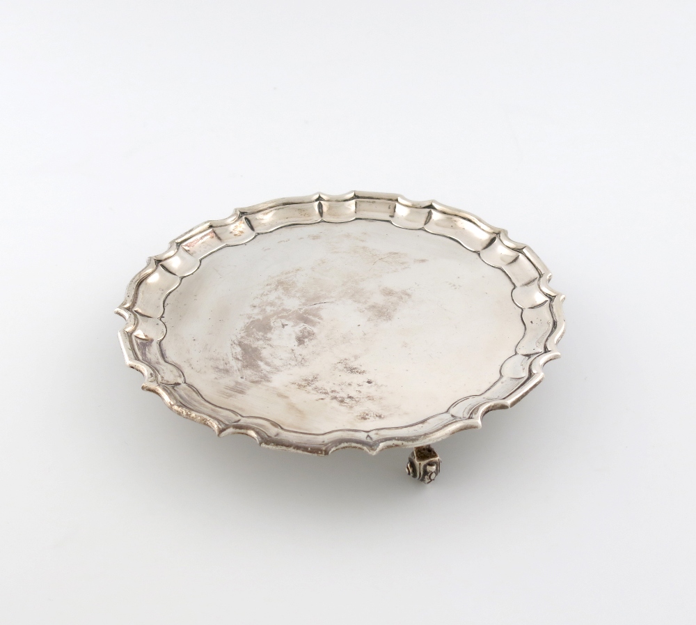 circular form, moulded border, on three gnarl feet, diameter 20.2cm, approx. weight 11.5oz.